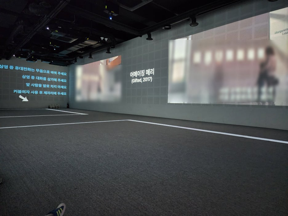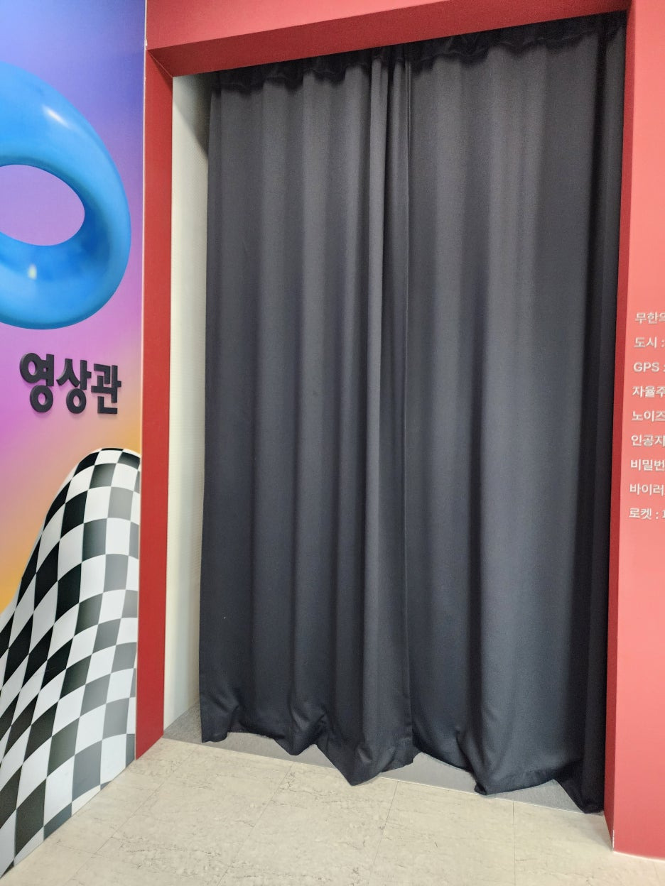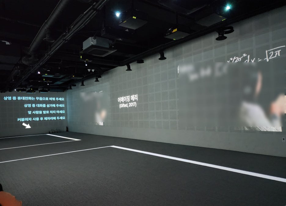 입구는 암막커튼으로 닫혀있고 들어가면 벽전체가 빔프로젝터로 영화가 상영되고 있었어요