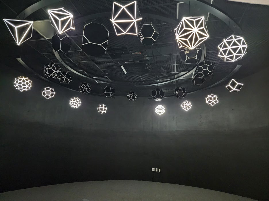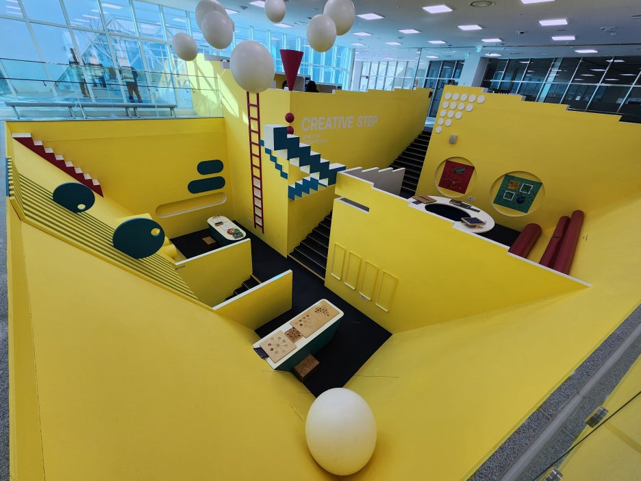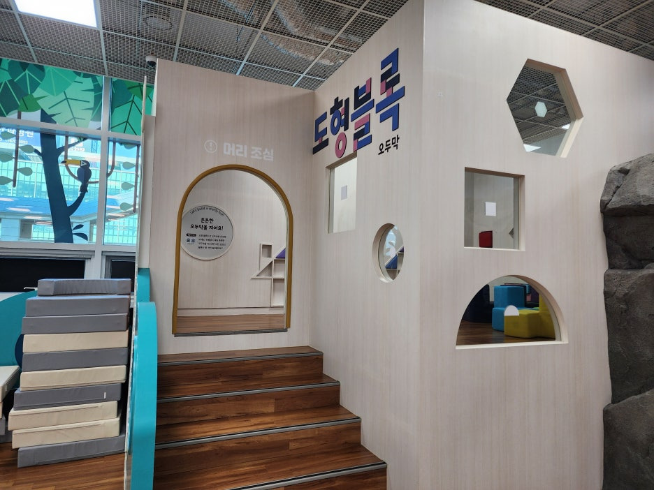 계단을 내려오면 각 체험 교구의 성격에 맞춰 공간을 분리하고 층별 도형 콘셉트인 다각형을 활용하여 게이트·프라이빗 게임공간·체험 테이블·교구 보관함 등을 만들어 놓았어요