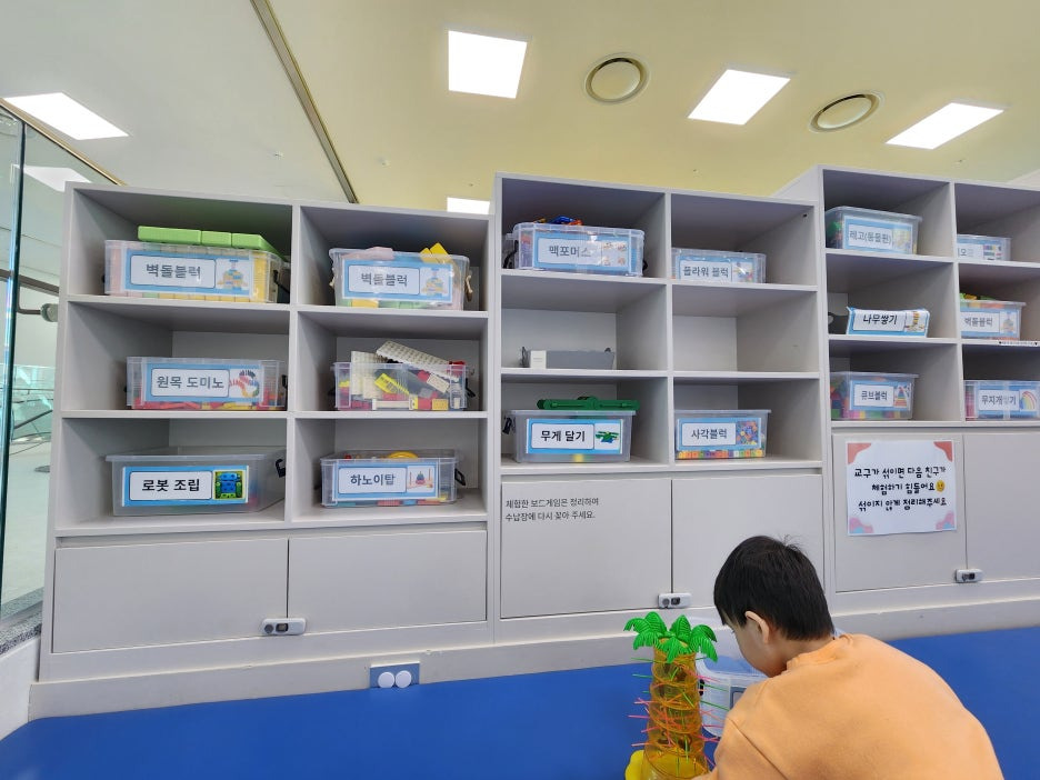 5층의 공간은 유아들이 놀 수 있는 블록 퍼즐 레고 같은 여러 종류의 수학 교구들이 있고 옆에는 큰아이들이 놀만한 보드게임존이 있어요