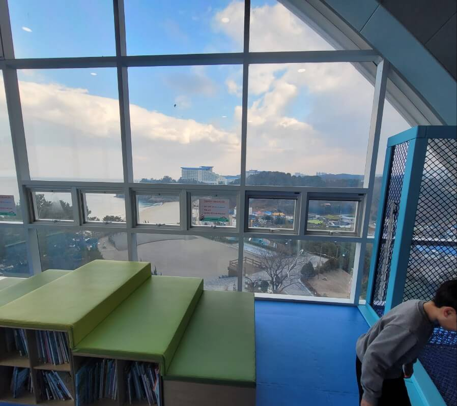 그림책관에서 계단을 이용해 위로 올라가면 창가 쪽으로 보이는 바다뷰가 있는 책을 읽을 수 있는 공간이 나와요