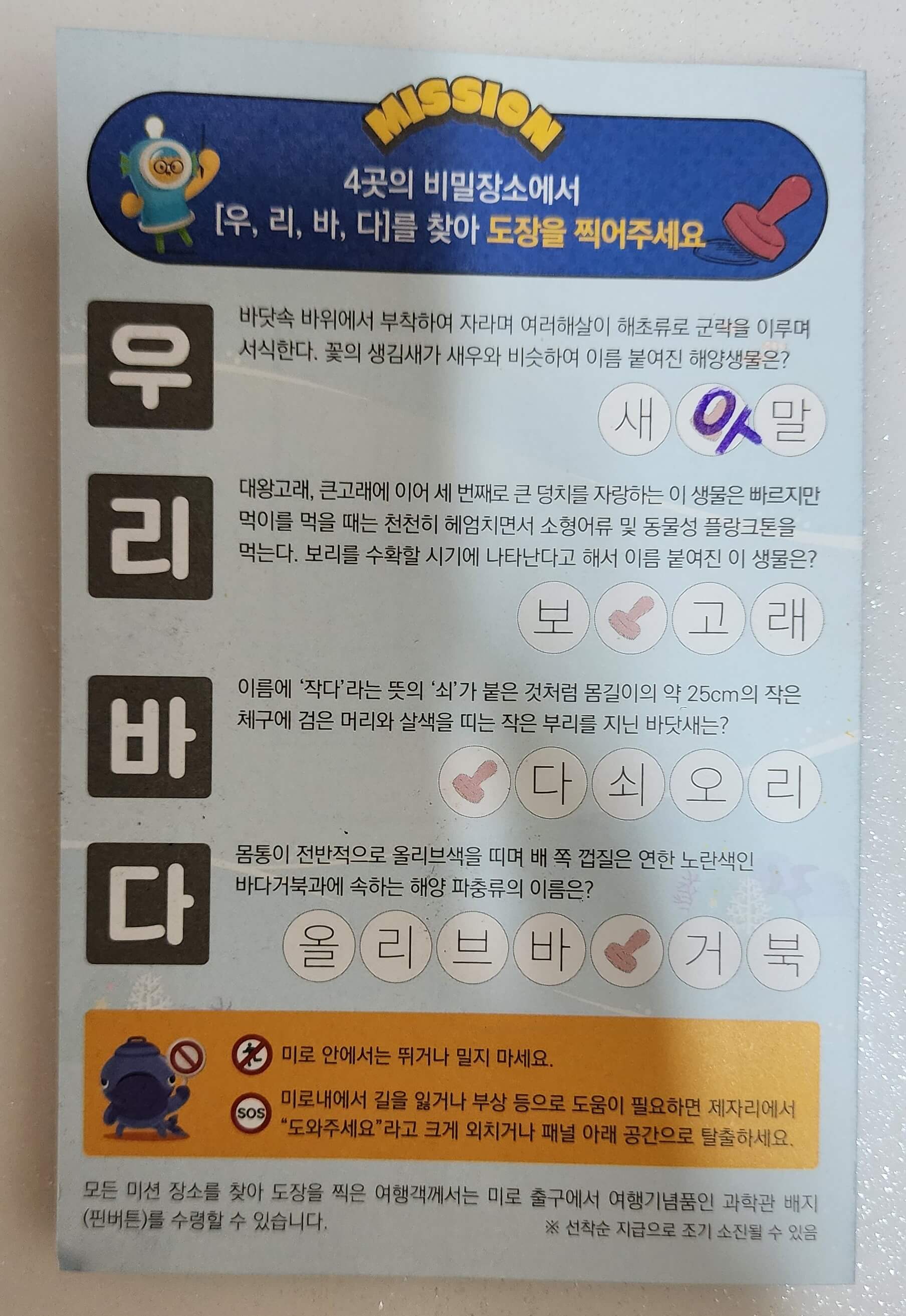 - 4곳의 비밀장소에서 미션을 성공하면 도장을 찍어줘요 다 찍고 미로 출구로 가면 귀여운 배지를 선물로 줘요