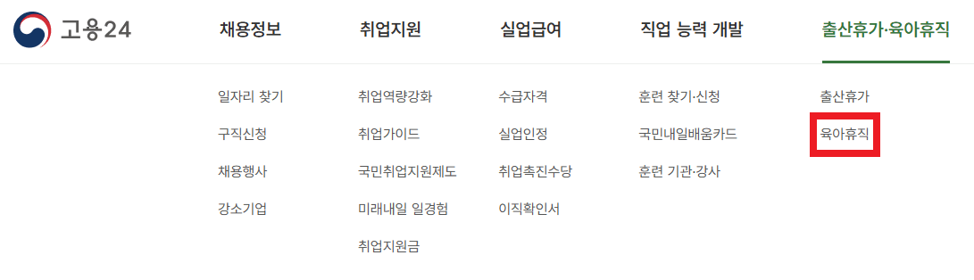 - 고용 24 홈페이지에 들어가서 로그인을 한 후 출산휴가·육아휴직의 육아휴직에 들어갑니다.