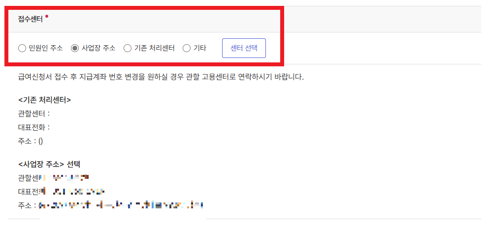 - 접수센터는 민원인 주소 / 사업장 주소 / 기타 등으로 선택 가능해 원하는 곳을 선택합니다.