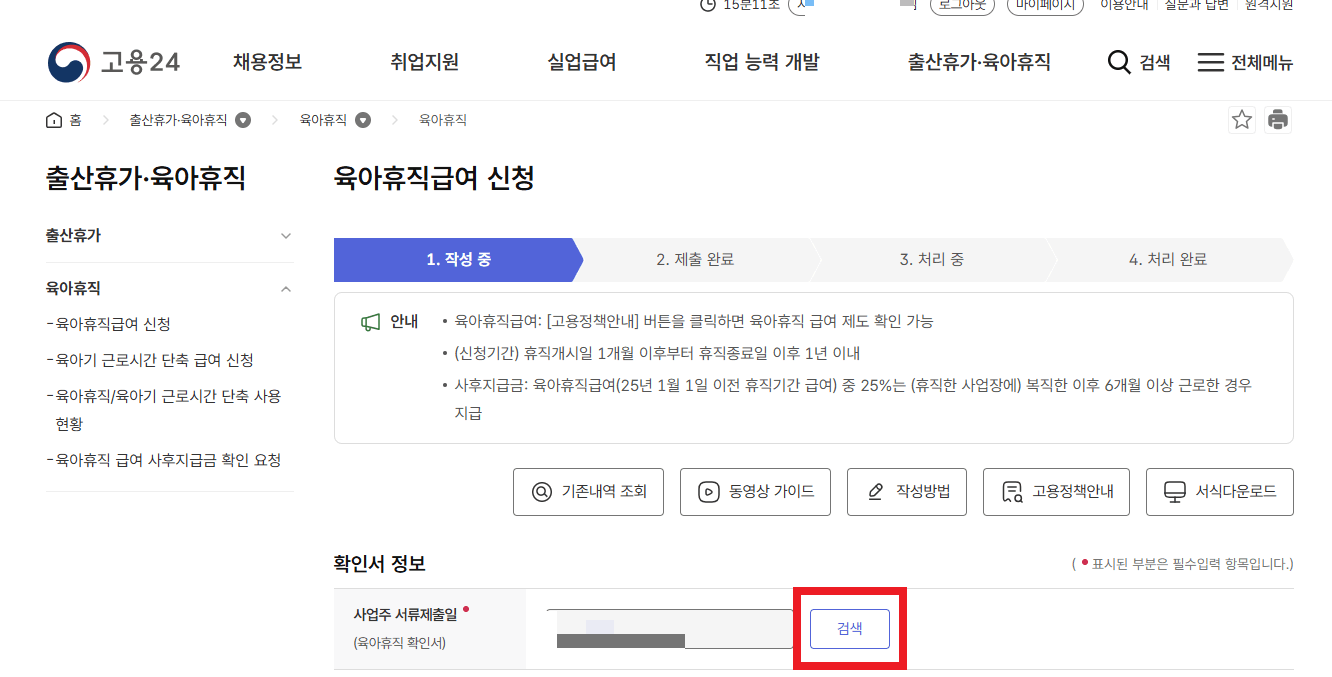 - 첨부파일에서 직장에서 받은 육아휴직 확인서 (받지 않았다면 고용 24에서 발급가능) 등록