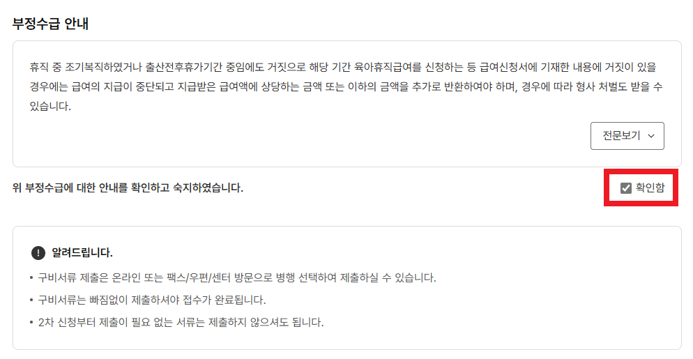 - 신청기한이 지나면 육아휴직급여를 지급받을 수 없으므로 반드시 신청 기한 내에 신청할 것
