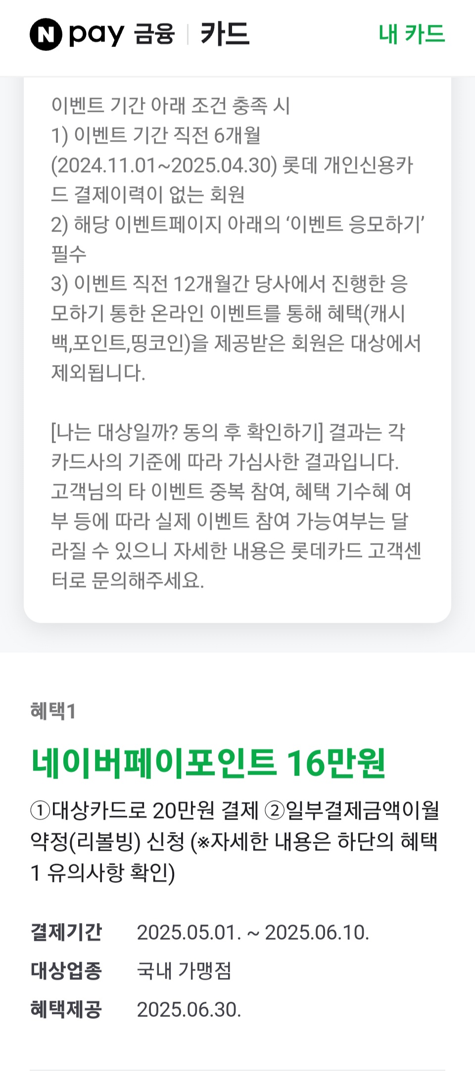 - 2024년 12월 16일쯤 카드를 발급받았고 상세조건인 카드로 20만 원 이상 결제를 하였습니다.