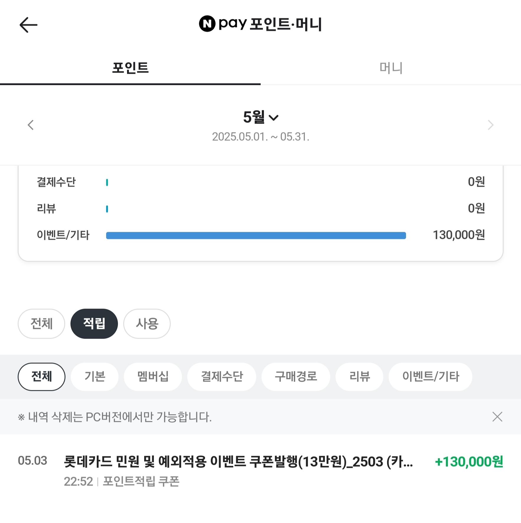 - 이벤트 요건 중 상세조건(00만 원 이상 결제, 리볼빙 신청 등)을 이행한다.