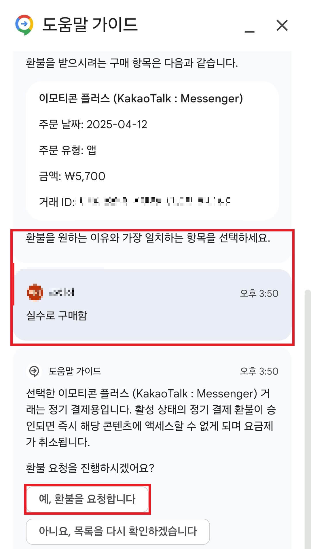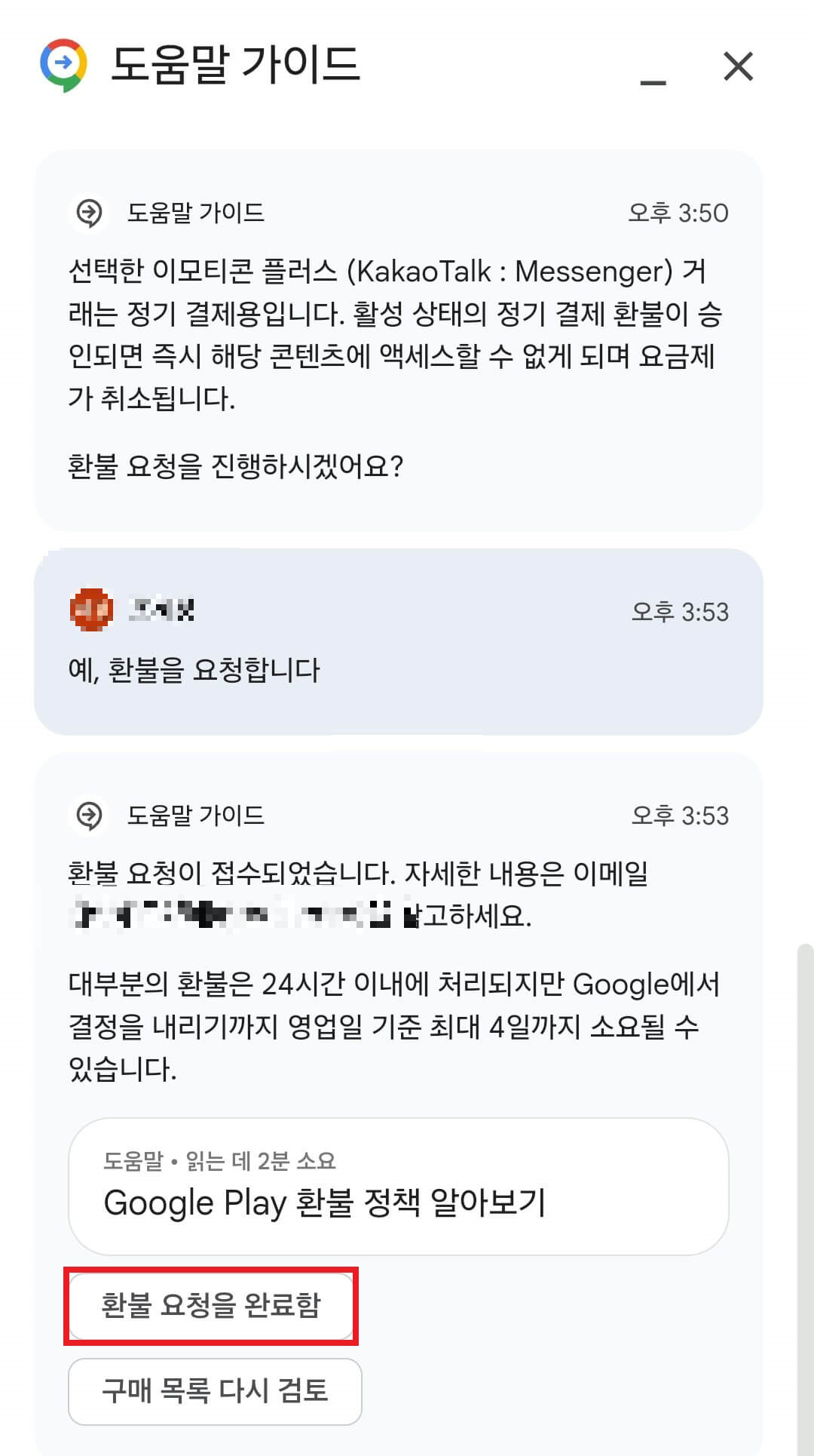 '환불 요청'을 누르면 도움말 가이드와 채팅을 하는데 여기서 환불 받으려는 구매항목을 선택합니다.