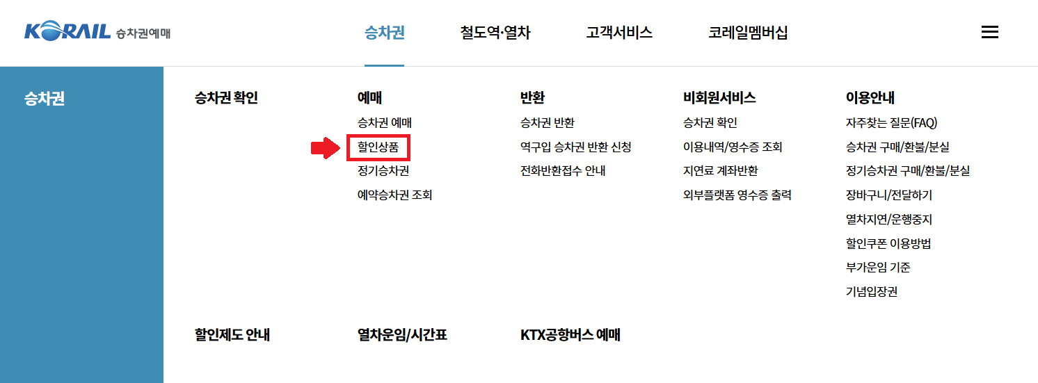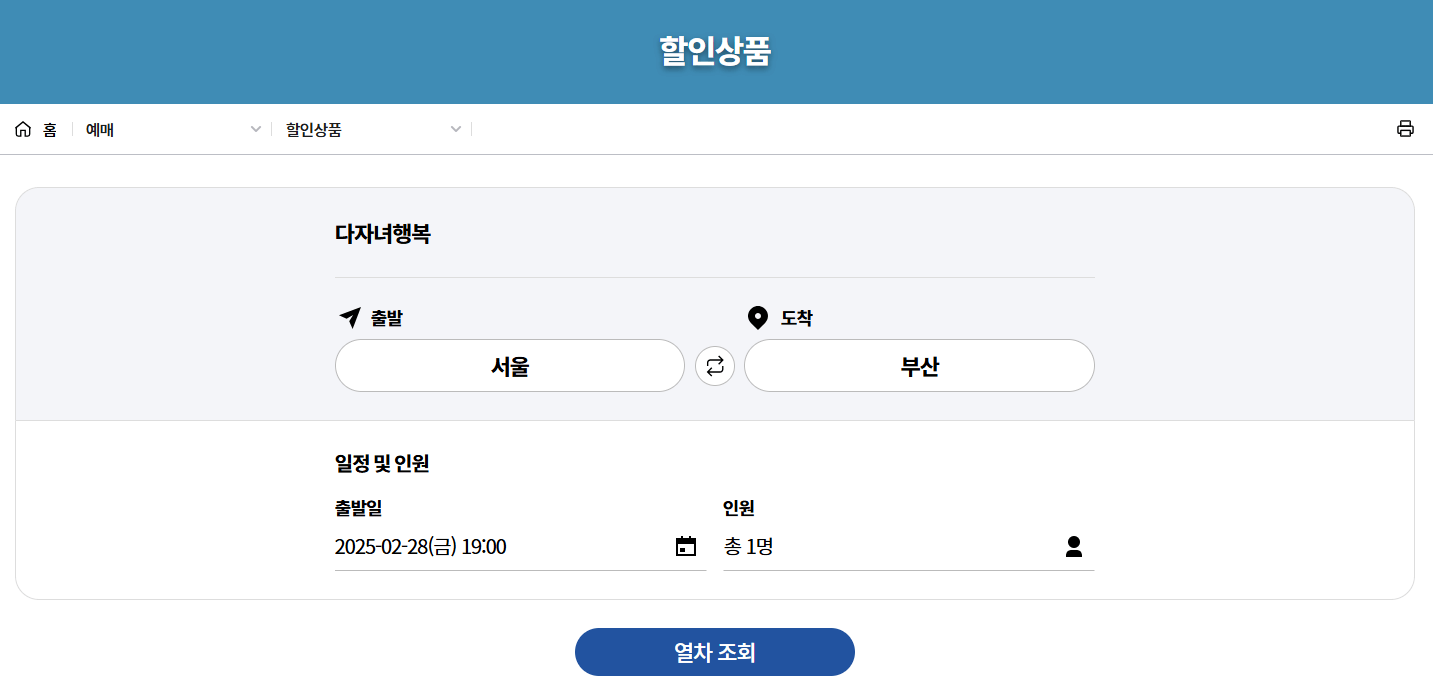 할인상품으로 예매하는 창에서 목적지와 인원 체크 후 예매를 진행하시면 됩니다.