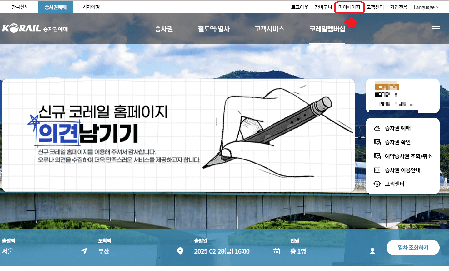 - 코레일 승차권예매 홈페이지 → 마이페이지 → 회원정보관리 → 나의 정보수정
