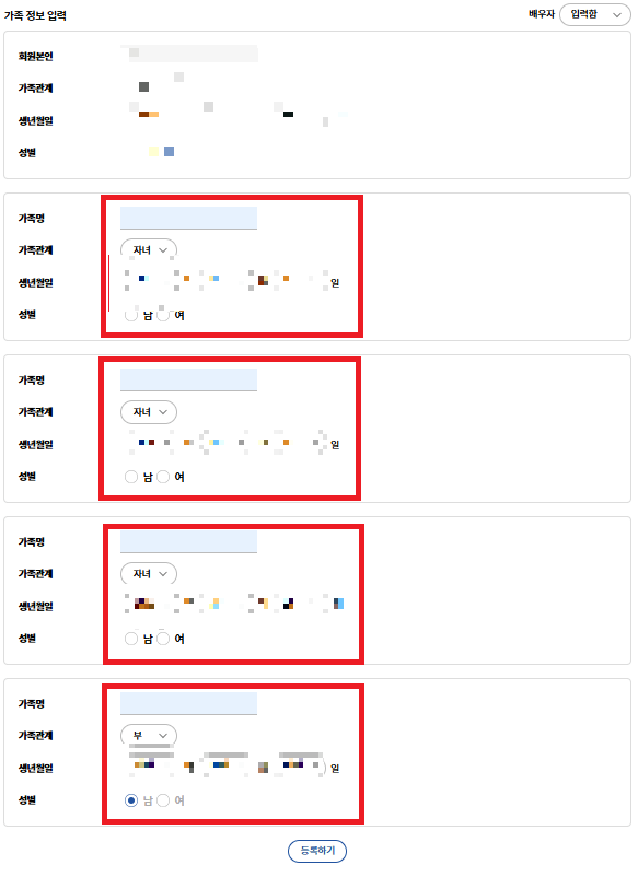 가족 정보 입력 창이 뜨면 본인을 제외한 자녀를 먼저 입력하고 마지막에 배우자를 입력합니다.