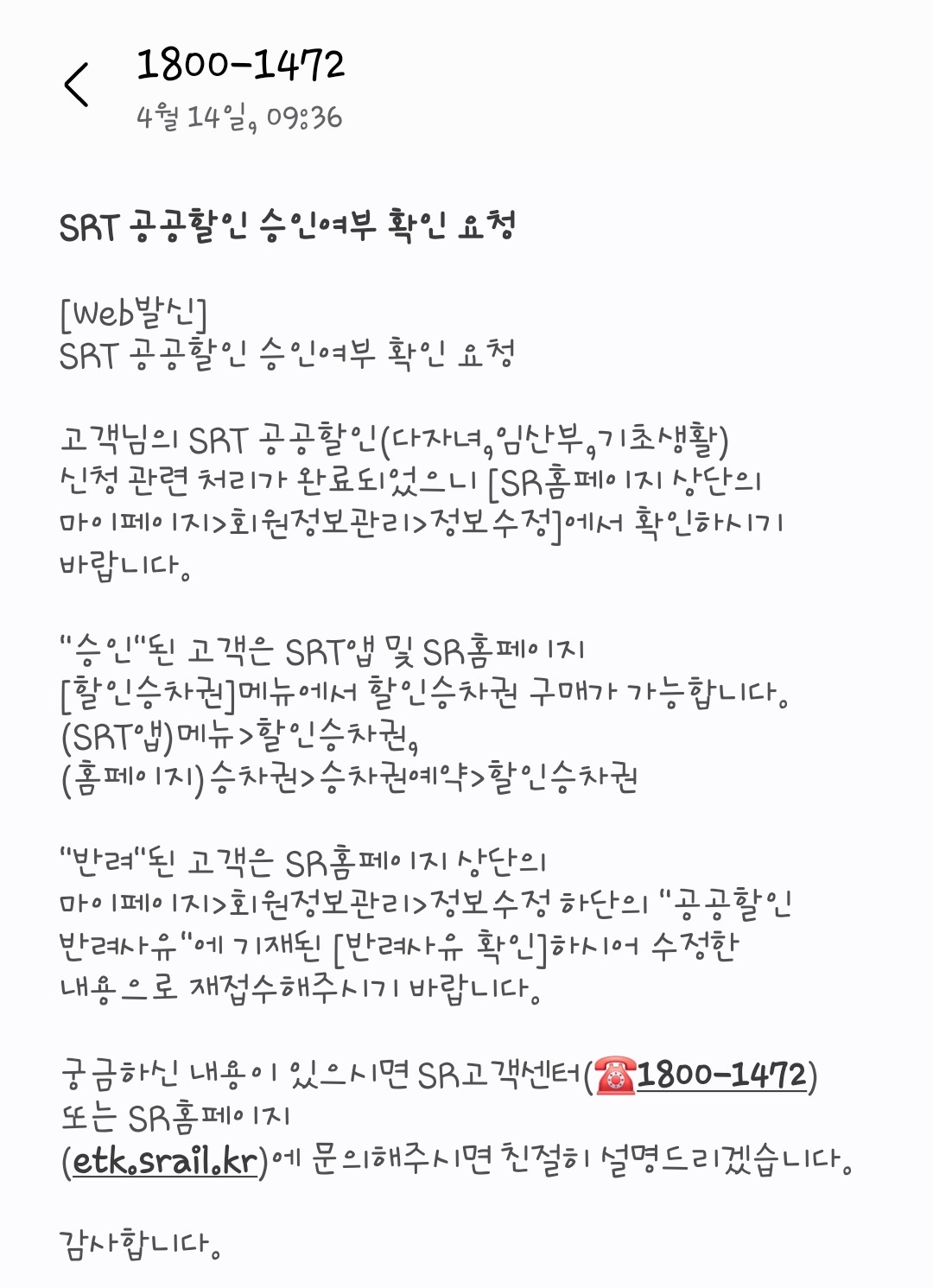 * 임산부 할인 : SR회원으로 할인대상 등록 및 인증 절차를 마친 임산부 외 보호자 1명에게 운임의 30% 할인제공
