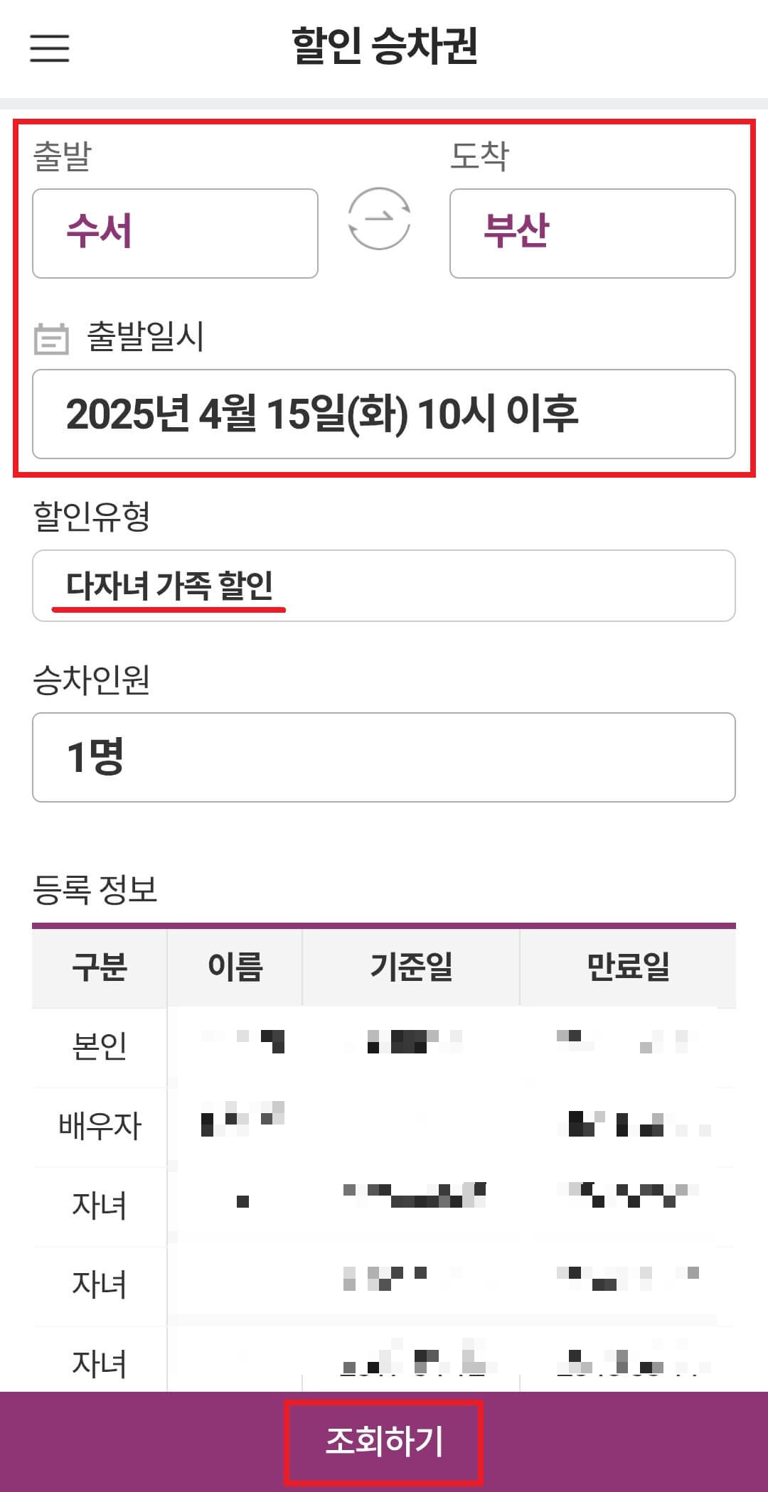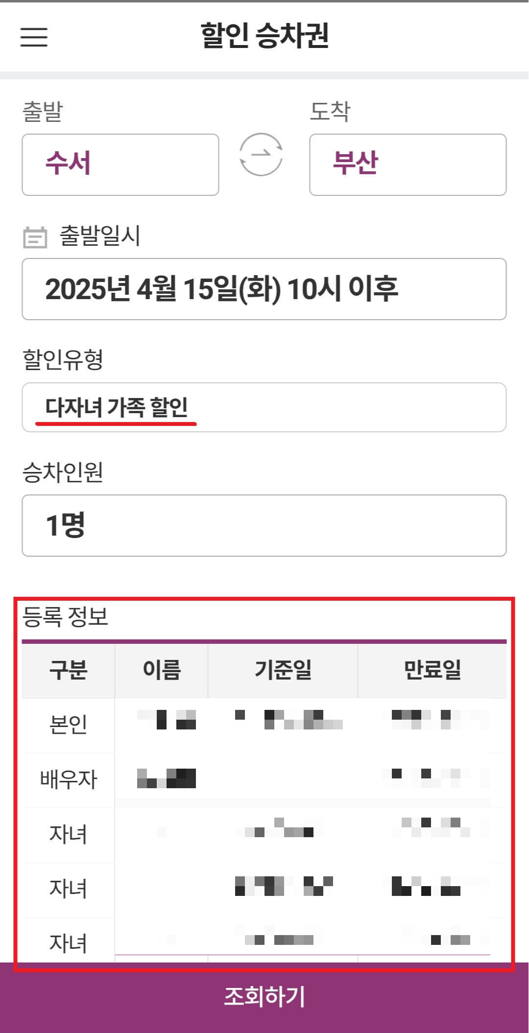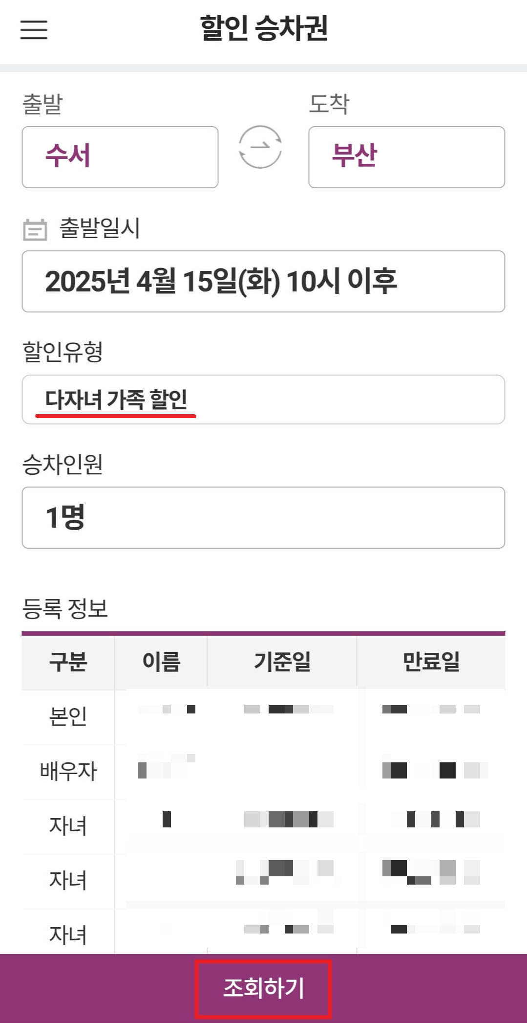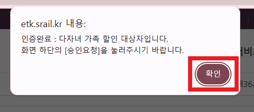 별도의 증빙서류 제출 또는 역방문 없이 '다자녀 가족 할인' 할인승차권 구매가 가능합니다.